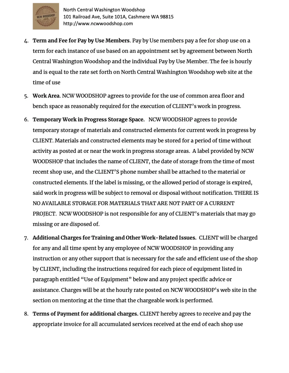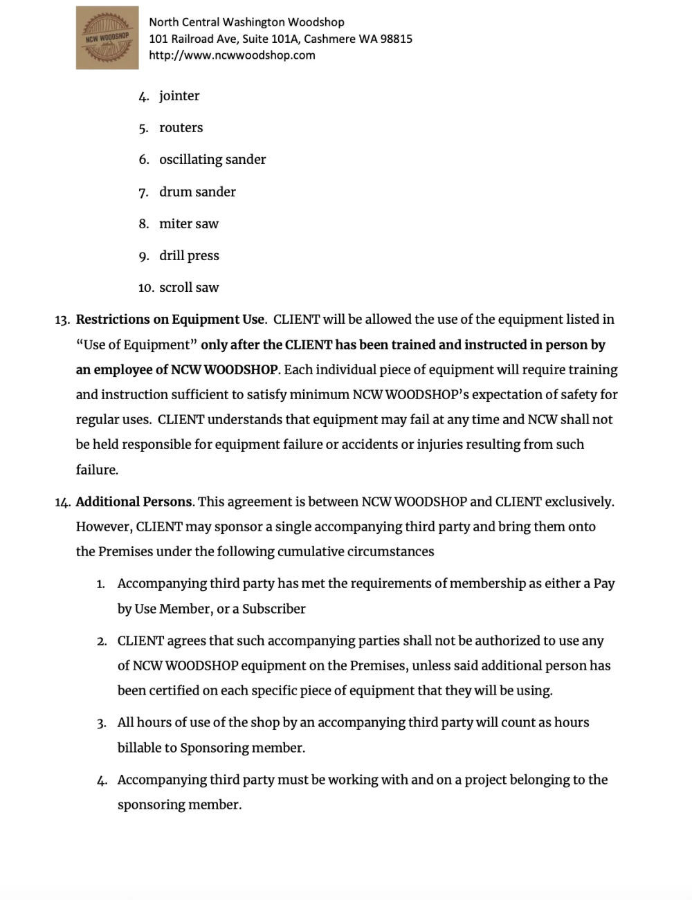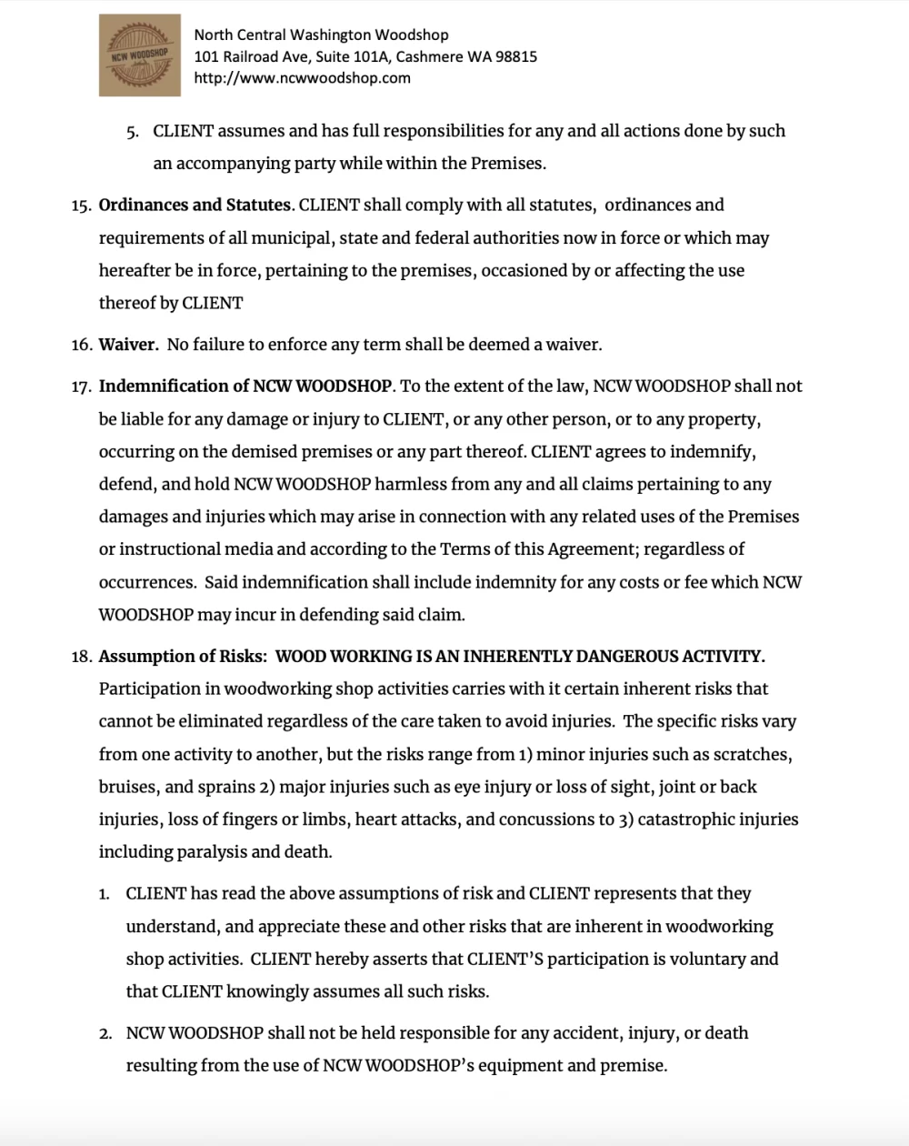 Please review and Sign the following form prior to attending a class at NCW Woodshop